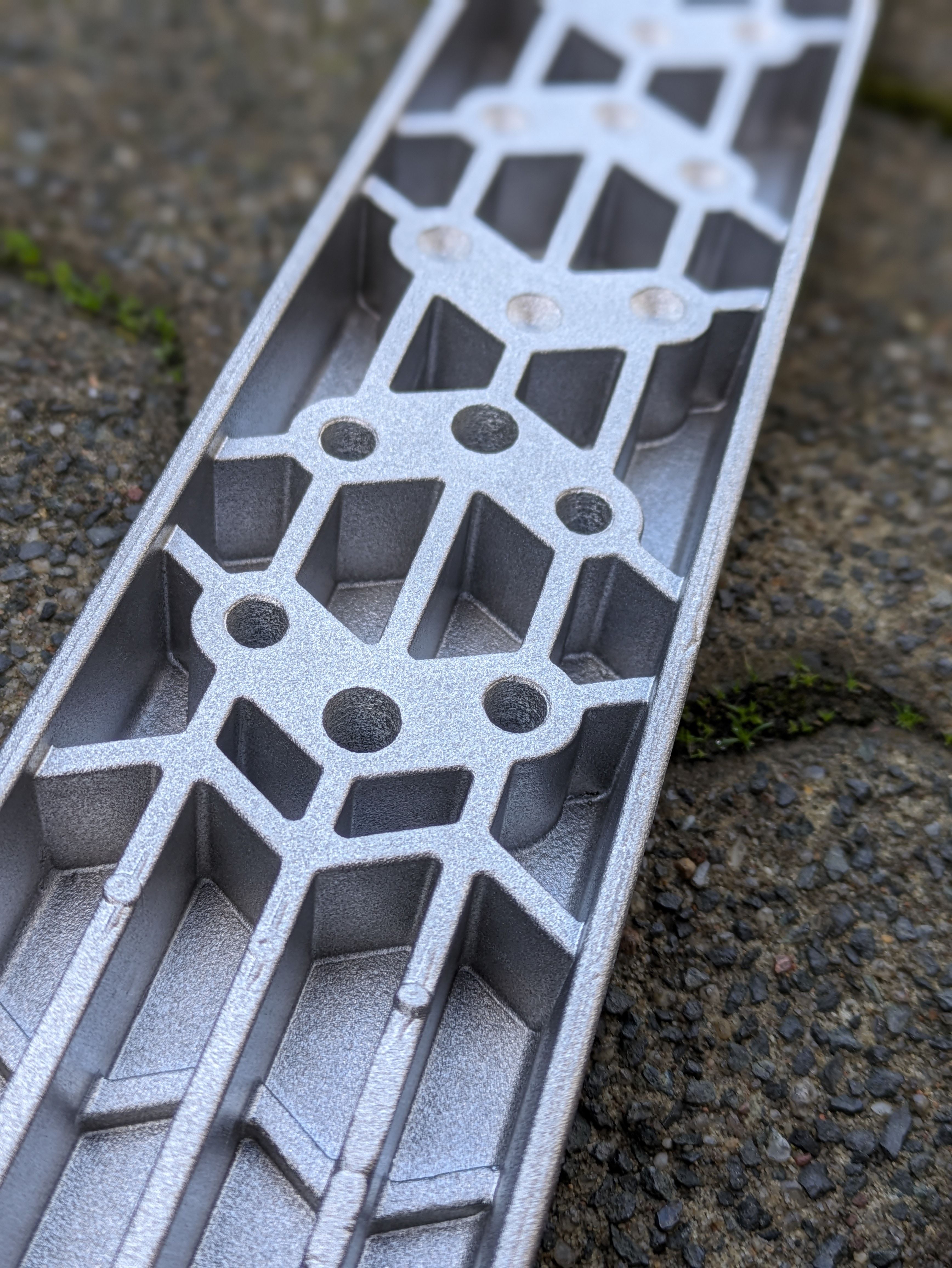 Nächstes Problem: Der Kunde wünscht variable Bohrbilder im Inneren des Gussteils und eingegossene Muttern. Dies können wir mit Körnungen und Zapfenaufnahmen leicht und kostengünstig umsetzen. Doch das verlangt an diesen Stellen Materialanhäufungen und das erhöht unvermeidlich die Gefahr von Lunkern und Einfallstellen in diesen und den äußeren Bereichen (nochmal kurze Erinnerung: Sichtflächen!) massiv. Zahlreiche Simulationsschleifen helfen uns letztendlich, die maximale Größe der Materialanhäufungen festzulegen, um ohne große Lunkergefahr gießen zu können und zugleich den sowieso schon trägen Materialfluss des dünnwandigen Bauteils (Länge Gussteil: 700mm; Wandstärke: 4,5mm) dabei nicht zu stören. Zumal der Kunde mit dem Plan an uns herangetreten ist, das ehemalige Stahl-Schweiß-Konstrukt des Bauteils in Sachen Stabilität deutlich zu verbessern. Ein Verbiegen des Gussteils soll bei der Länge und der geringen Wandstärke unbedingt vermieden werden! In solchen Fällen hilft Abgucken in der Natur: Eine Wabenstruktur erhöht mit minimalem Aufwand die mechanische Festigkeit enorm. Doch wie erhaben sollen die Waben ausgebildet sein? Reichen diese allein aus, um ein Verbiegen zu verhindern? An dieser Stelle sollte man manchmal einfach nur probieren, will man sich aufwendige und teure Berechnungen und den zu voreiligen Kokillenbau sparen. „Probieren“ sieht in unserem Fall so aus: Der Prototyp wird 3D-gedruckt und anschließend bei einer befreundeten Gießerei als Modell in Sand abgegossen. Ergebnis: Der Fuß verbiegt sich trotzdem noch. Also konstruieren wir wieder um. Es folgt quasi eine Vermischung von 4mm hohen Stegen mit den vorhandenen Waben, wodurch endlich die nötige Steifigkeit erreicht werden soll. Mit der Idee geht es wieder ab zum 3D-Druck und danach in den Sand. Ergebnis: So kann man es lassen.Das letzte Wort